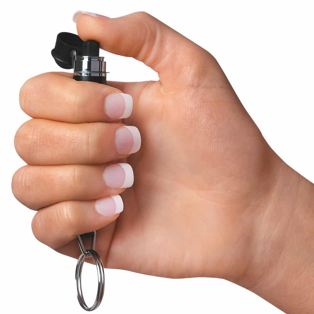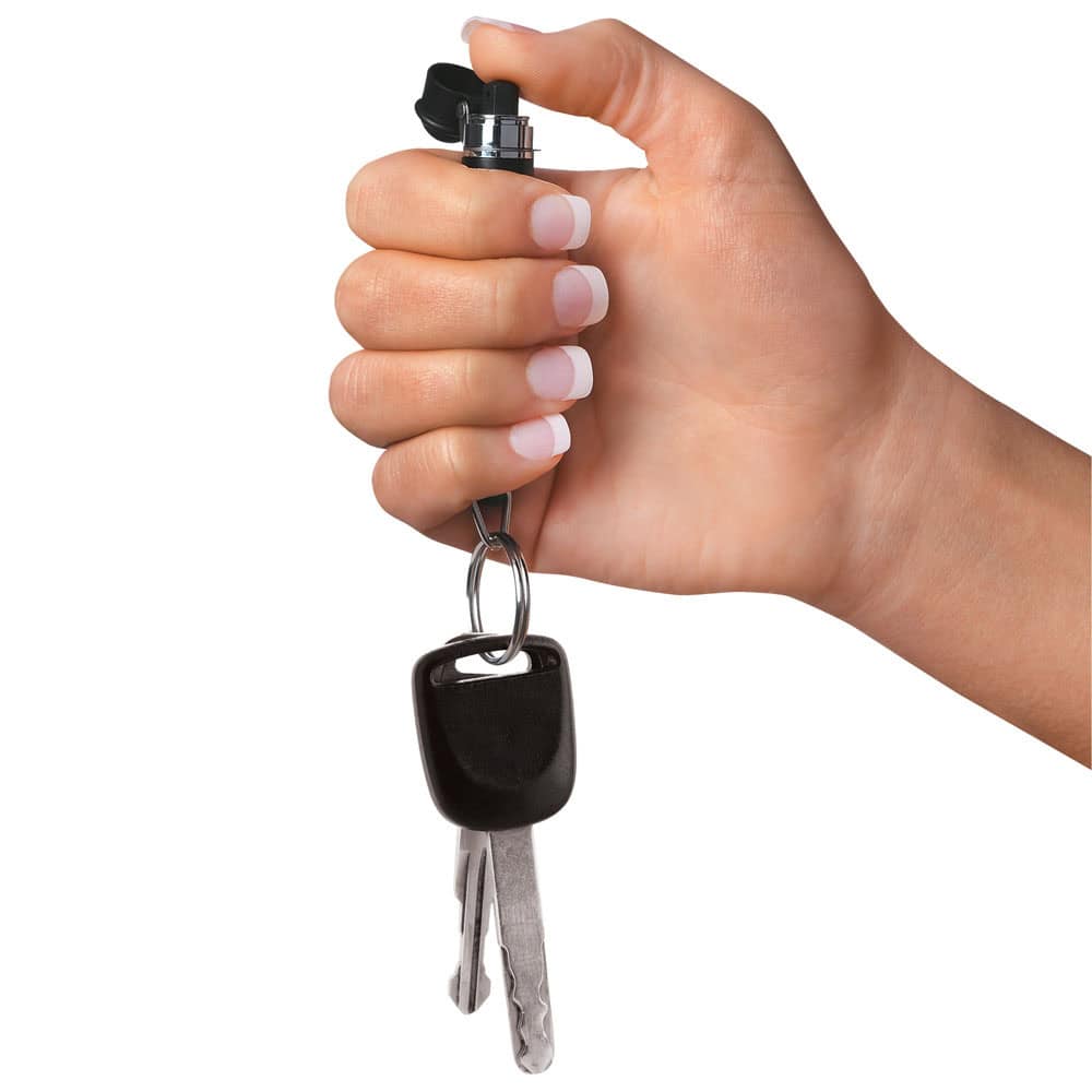 Practical Details: Contains: 0.14 oz. Range: 5 feet. Bursts: 6 one second. Weight: 0.2 lbs. Safety: Hinged Cap. Included: Keyring. Check local regulations—pepper spray laws vary by state with some restrictions on concentration and size.
