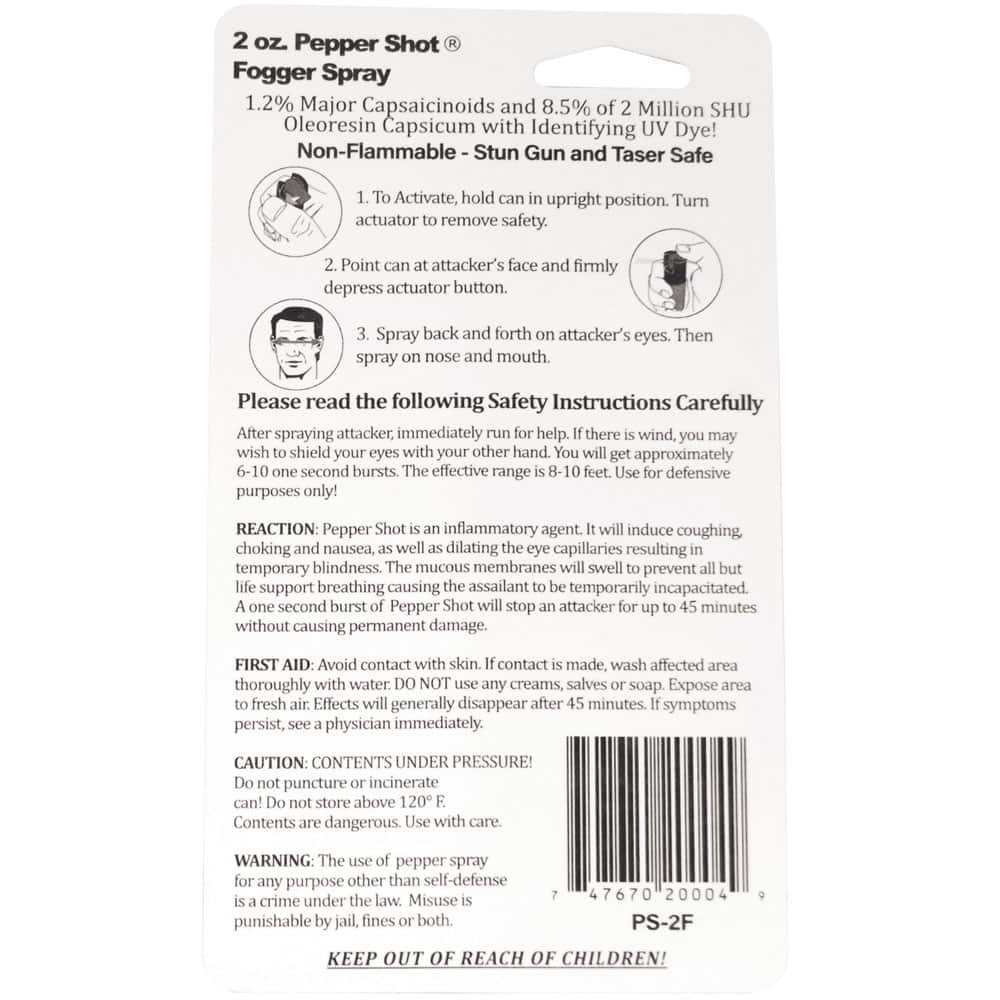 The Pepper Shot Pepper Spray 1.2% MC 2 oz provides powerful personal protection with wide fog pattern for area coverage. Featuring 1.20% Major Capsaicinoids, 2 Million Scoville Heat Units, 8-10 feet range, 6-10 one second bursts, this fogger spray gives you the confidence to handle threatening situations from a safe distance.